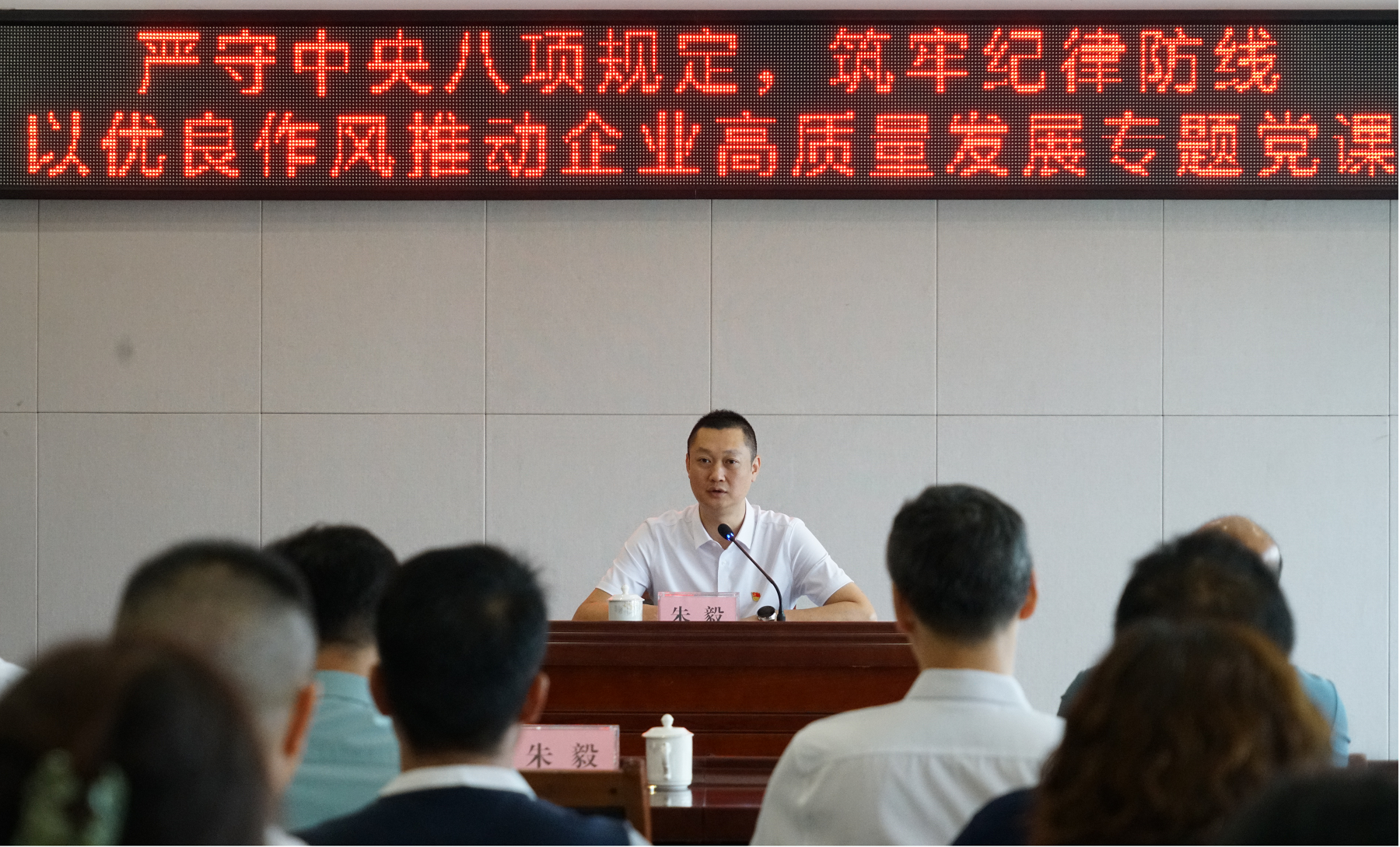 2025年7月8日,集團(tuán)黨委書記、董事長朱毅同志以“嚴(yán)守中央八項(xiàng)規(guī)定,筑牢紀(jì)律防線,以優(yōu)良作風(fēng)推動企業(yè)高質(zhì)量發(fā)展”為題,為集體黨員干部講授專題黨課,由集團(tuán)黨委副書記、紀(jì)委書記譚力源主持。此次黨課圍繞理論認(rèn)知、案例警示、實(shí)踐落實(shí)三個(gè)方面展開,深入淺出地闡釋了中央八項(xiàng)規(guī)定精神的豐富內(nèi)涵與重要意義。