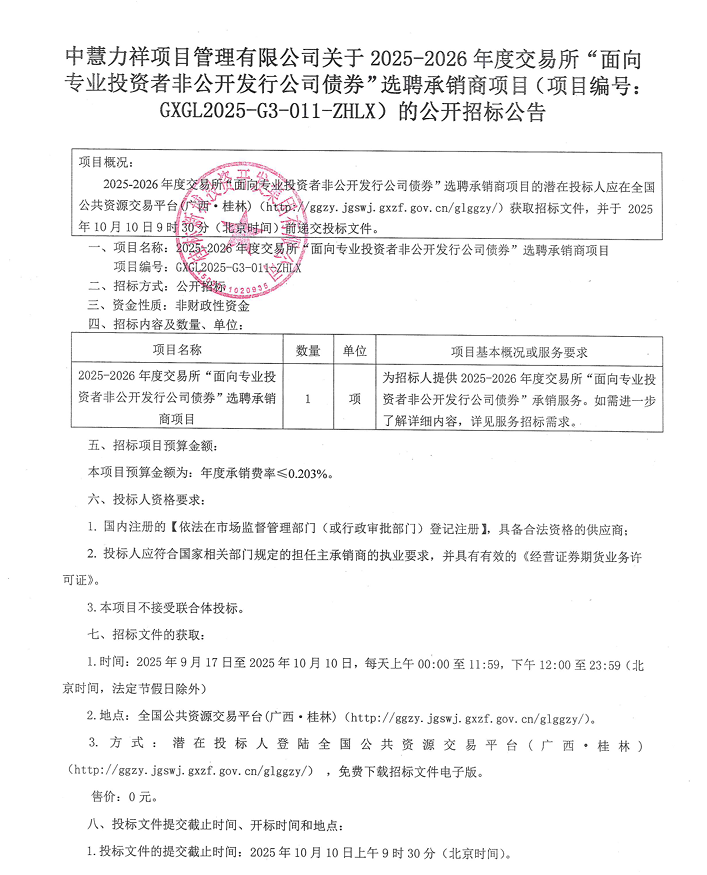中慧力祥項(xiàng)目管理有限公司關(guān)于2025-2026年度交易所“面向?qū)I(yè)投資者非公開(kāi)發(fā)行公司債券”選聘承銷商項(xiàng)目(項(xiàng)目編號(hào):GXGL2025-G3-011-ZHLX)的公開(kāi)招標(biāo)公告