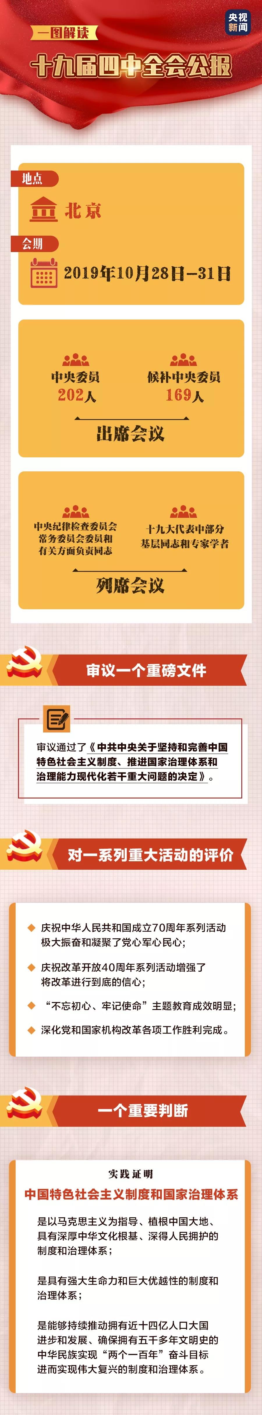 黨的十九屆四中全會(huì)在北京勝利閉幕,這是在慶祝新中國(guó)成立70周年的重要節(jié)點(diǎn),向全面建成小康社會(huì)、實(shí)現(xiàn)第一個(gè)百年奮斗目標(biāo)邁進(jìn)的關(guān)鍵之年召開的一次重要會(huì)議,充分肯定我們黨治理國(guó)家取得的歷史性成就,全面總結(jié)我國(guó)國(guó)家制度和國(guó)家治理體系的顯著優(yōu)勢(shì),明確了加強(qiáng)和完善國(guó)家治理必須堅(jiān)持的基本原則以及總體目標(biāo)、工作要求,為堅(jiān)定制度自信、實(shí)現(xiàn)偉大夢(mèng)想提供了根本遵循,指明了正確方向。