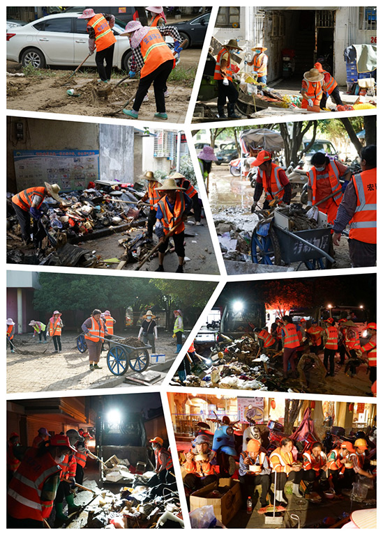 在龍船坪小區(qū)、安新小區(qū)、寧遠(yuǎn)小學(xué)及周邊街道,一群身著橘紅色馬甲、印有“宏謀環(huán)衛(wèi)”的環(huán)衛(wèi)工人成為了救災(zāi)現(xiàn)場的一道亮麗風(fēng)景線。他們不畏艱難,深一腳淺一腳地踩在垃圾堆和泥漿中,一鍬一鍬地清理垃圾和淤泥。現(xiàn)場工作人員齊心協(xié)力,面對困難毫不退縮,甚至唱起了《團(tuán)結(jié)就是力量》來鼓舞士氣。經(jīng)過晝夜奮戰(zhàn),他們終于將小區(qū)道路上的垃圾清運(yùn)完畢,有效保障了道路的正常通行和居民的出行安全,及時防止災(zāi)后疫情的發(fā)生。