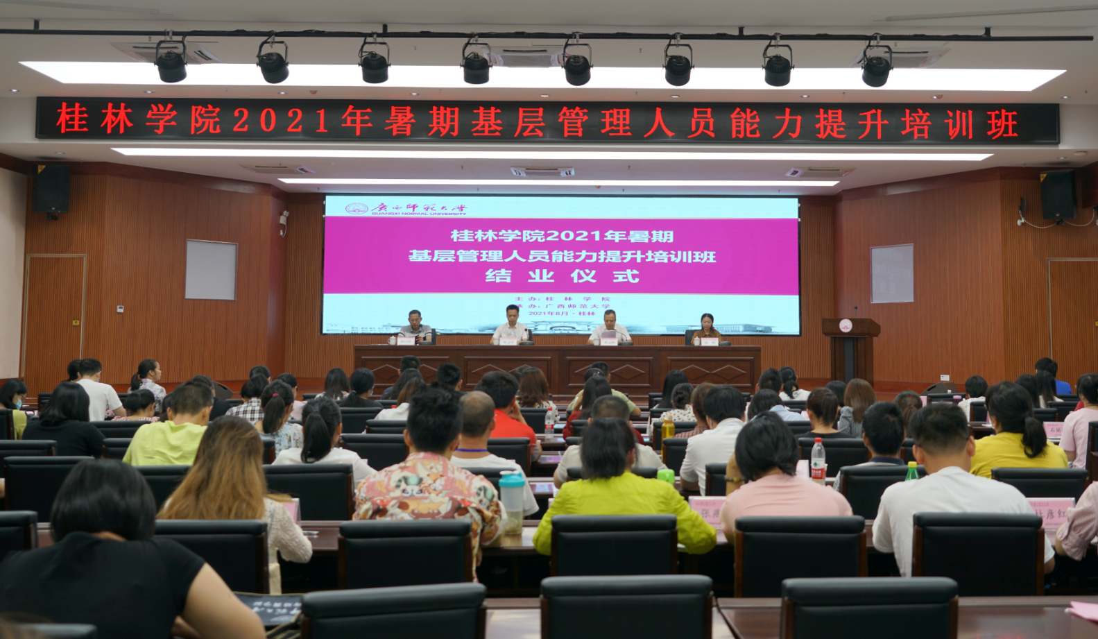 8月2日下午,桂林學(xué)院基層管理人員能力提升培訓(xùn)班結(jié)業(yè)儀式在廣西師范大學(xué)育才校區(qū)國際教育交流中心報告廳舉行,共有來自桂林學(xué)院的98名基層管理人員參加了這次為期三天的培訓(xùn)。廣西師范大學(xué)黨委常委、組織部部長林國慶,桂林新城投資集團黨總支書記、董事長、總經(jīng)理、桂林學(xué)院董事長周道林,桂林學(xué)院校長楊樹喆等出席結(jié)業(yè)儀式。廣西師范大學(xué)干部教育培訓(xùn)學(xué)院辦公室主任許鋼主持結(jié)業(yè)儀式。