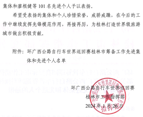 近日,根據(jù)《環(huán)廣西公路自行車世界巡回賽桂林市工作指揮部關(guān)于表揚(yáng)環(huán)廣西公路自行車世界巡回賽桂林市籌備工作先進(jìn)集體和先進(jìn)個(gè)人的通報(bào)》(市環(huán)指[2024]1號)獲悉,新城投集團(tuán)下屬宏謀物業(yè)公司李楓彥同志獲環(huán)廣西公路自行車世界巡回賽桂林市籌備工作先進(jìn)個(gè)人。
