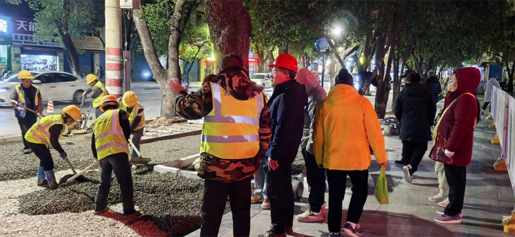 為確保蘆笛小學(xué)教學(xué)活動正常進(jìn)行,最大限度降低對周邊居民日常出行的影響,項目采取夜間和周末加班加點(diǎn)的工作方式,全體黨員干部職工發(fā)揚(yáng)“五加二、白加黑”的奮斗精神,爭分奪秒推進(jìn)工程進(jìn)度,成功在兩天內(nèi)超額完成蘆笛小學(xué)門口130多米人行道1300多平方米的透水混凝土改造任務(wù),彰顯了項目團(tuán)隊高效的施工能力和團(tuán)結(jié)協(xié)作的精神風(fēng)貌,充分展現(xiàn)了黨員的先鋒模范作用。